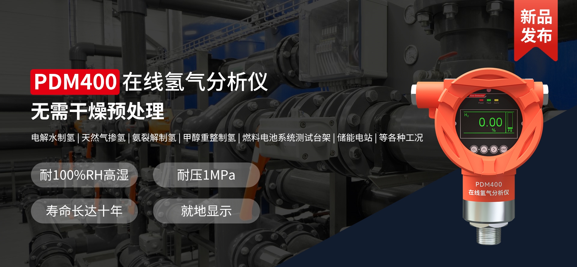 電解水、天然氣、氫分裂制氫,輸氫管道、氫氣置換,制氫站、加氫機、卸氣柱、撬裝站、氫燃料電池汽車及系統(tǒng)測試臺架、熱電聯(lián)供、氫滲氫實驗室、涉氫生產(chǎn)廠房、氫氣氣瓶間等場合中的氫氣濃度、純度、濕度檢測。